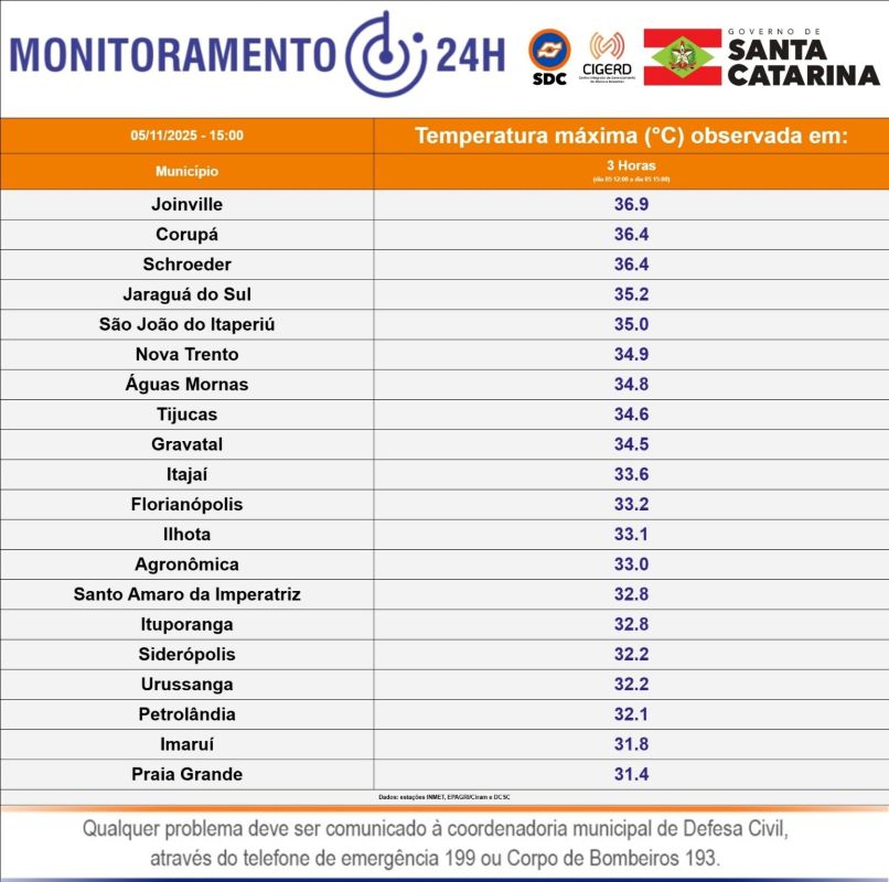 O destaque do período foi Joinville, no Norte do Estado, que registrou a temperatura mais alta: 36,9°C. Na sequência, Corupá e Schroeder marcaram 36,4°C, enquanto Jaraguá do Sul chegou a 35,2°C.