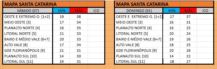 No sábado (7), as temperaturas seguem elevadas em grande parte de Santa Catarina, com máximas entre 30°C e 38°C, especialmente no Oeste e Extremo Oeste. No Litoral, Vale do Itajaí e Grande Florianópolis, os termômetros ficam em torno dos 31°C a 33°C, enquanto nas áreas mais altas do Planalto Sul e Litoral Sul as máximas ficam próximas dos 30°C. À noite, com a mudança na direção dos ventos, as temperaturas podem cair abaixo dos 20°C nas regiões de maior altitude.