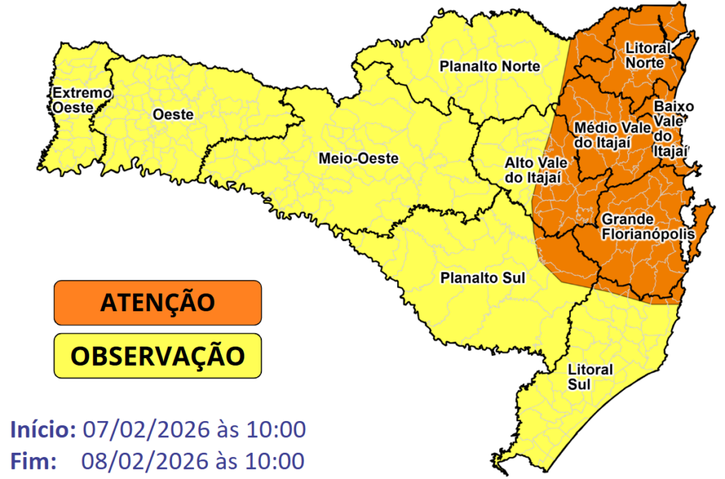 No sábado (7), o dia ainda começa abafado, com temperaturas próximas ou acima dos 30°C, especialmente no Oeste e no Litoral Norte. A partir do fim da manhã e início da tarde, o avanço do sistema frontal – frente fria – provoca aumento da nebulosidade e ocorrência de chuva. Nesse período, o risco é alto para temporais com chuva intensa entre a Grande Florianópolis, o Vale do Itajaí e o Litoral Norte, e moderado nas demais regiões do estado.