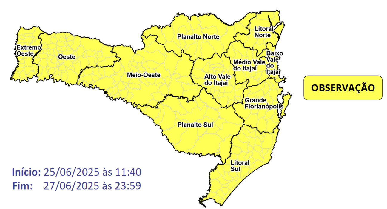 Ao longo de toda quinta (26), o tempo permanece instável com chuva intensa e condição para temporais isolados pelo estado. De forma geral, espera-se volumes entre 60 e 80 mm com pontuais acima de 100 mm pelo estado, especialmente entre o Grande Oeste, Planalto Sul, Alto Vale do Itajaí e parte do Planalto Norte.