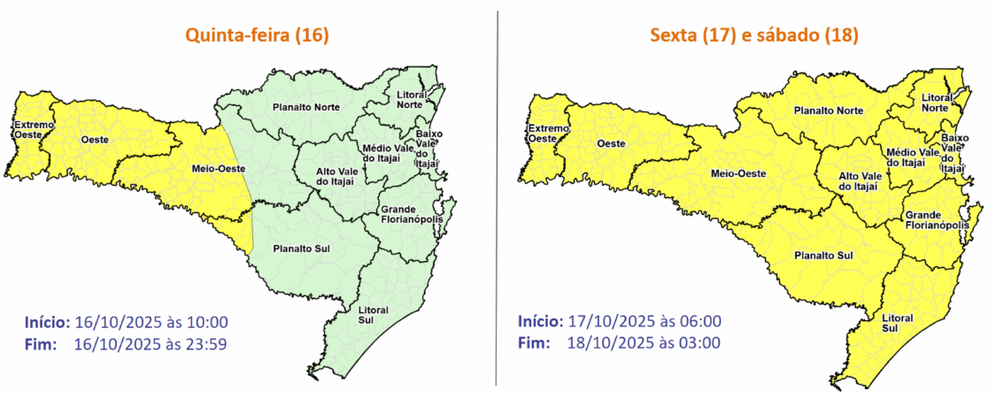 Na quinta-feira (16), o tempo fica instável em todas as regiões. Entre o Grande Oeste, os Planaltos e parte do Vale do Itajaí, as instabilidades atmosféricas provocam temporais, que podem vir acompanhados de ventos fortes e eventual queda de granizo. O risco para ocorrências associadas aos temporais é baixo a moderado.