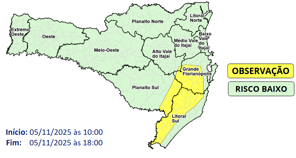 Ao longo do dia, a passagem da frente fria pode provocar temporais isolados e chuva intensa, principalmente nas áreas de encosta entre o Planalto Sul, Litoral Sul e a Grande Florianópolis.