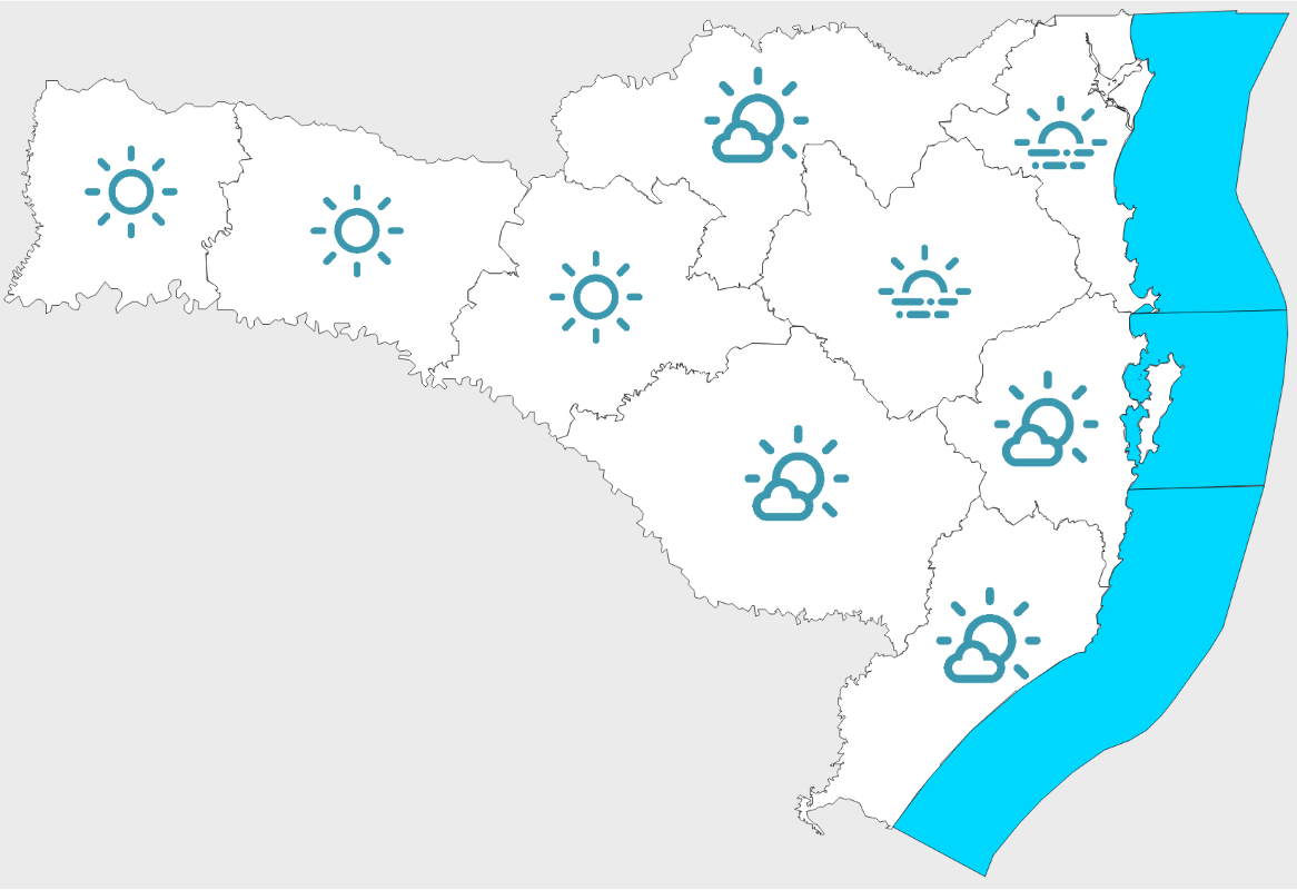 O risco para ocorrências associadas ao tempo é baixo a moderado. As temperaturas mínimas variam entre 9°C e 22°C. Durante a tarde, com o tempo mais fechado no Oeste e Sul, os termômetros não sobem muito. Já entre a Grande Florianópolis, Vale do Itajaí, Planalto e Litoral Norte, o sol ainda aparece e favorece máximas entre 23°C e 28°C.