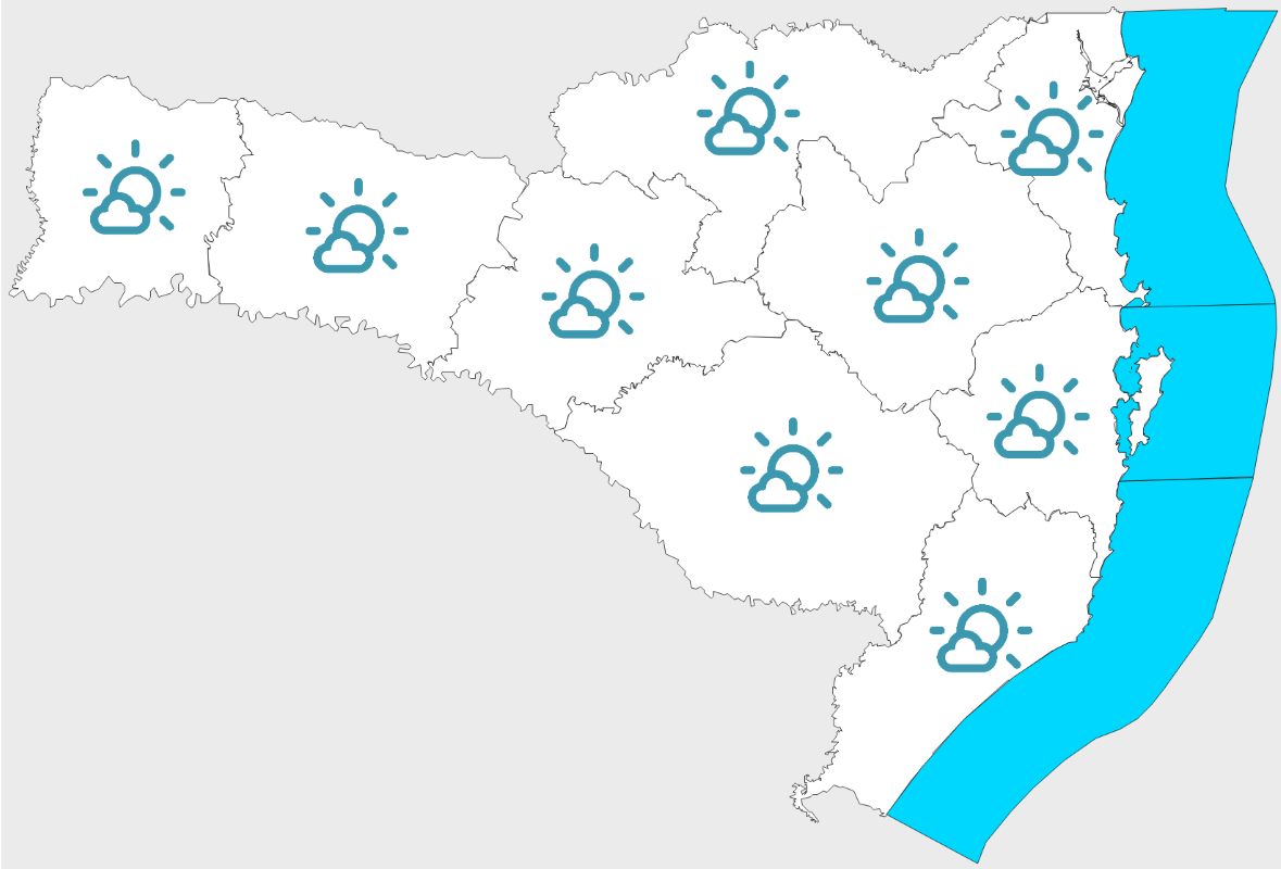 Há chance de precipitação invernal durante a madrugada na Serra catarinense. Apesar do predomínio do tempo firme e do sol entre nuvens à tarde, as máximas não ultrapassam os 10°C na maior parte do estado, chegando a até 15°C no Litoral. O mar segue agitado, com risco moderado para a costa.