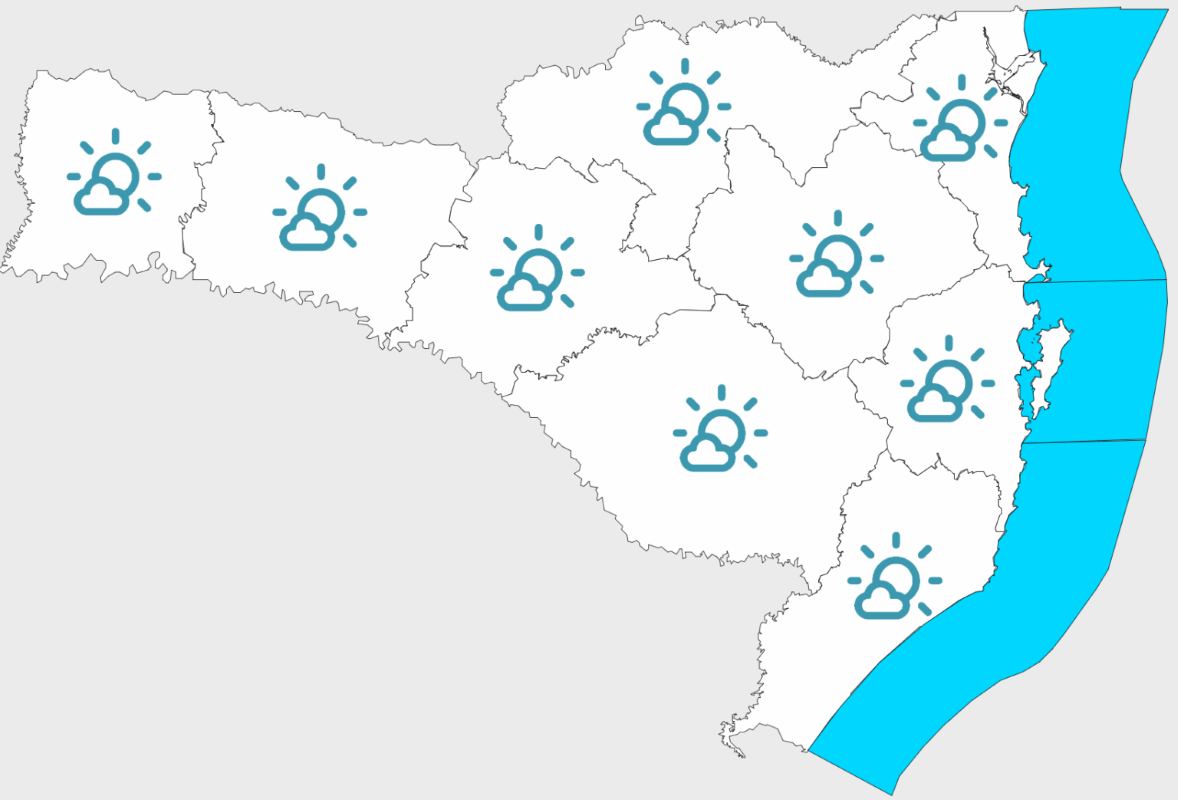 As temperaturas mínimas variam entre 9°C e 14°C nos Planaltos, Meio-Oeste e serra, e entre 14°C e 18°C nas demais regiões. À tarde, as máximas passam dos 30°C no Oeste e no Litoral Sul.