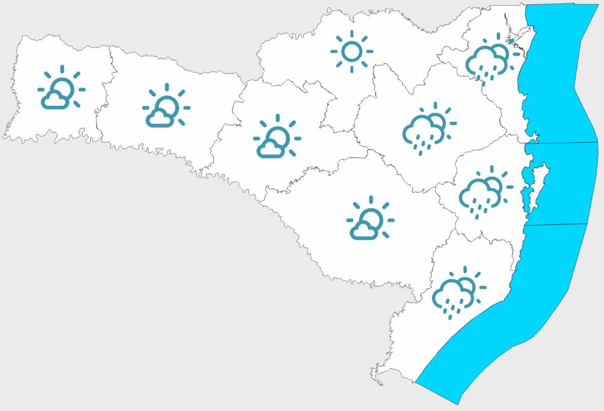 Apenas nas áreas litorâneas, especialmente entre a Grande Florianópolis e o Litoral Norte, nas áreas serranas do leste e no Vale do Itajaí, a circulação marítima ainda favorece a ocorrência de chuvas fracas e passageiras, principalmente nos extremos do dia.