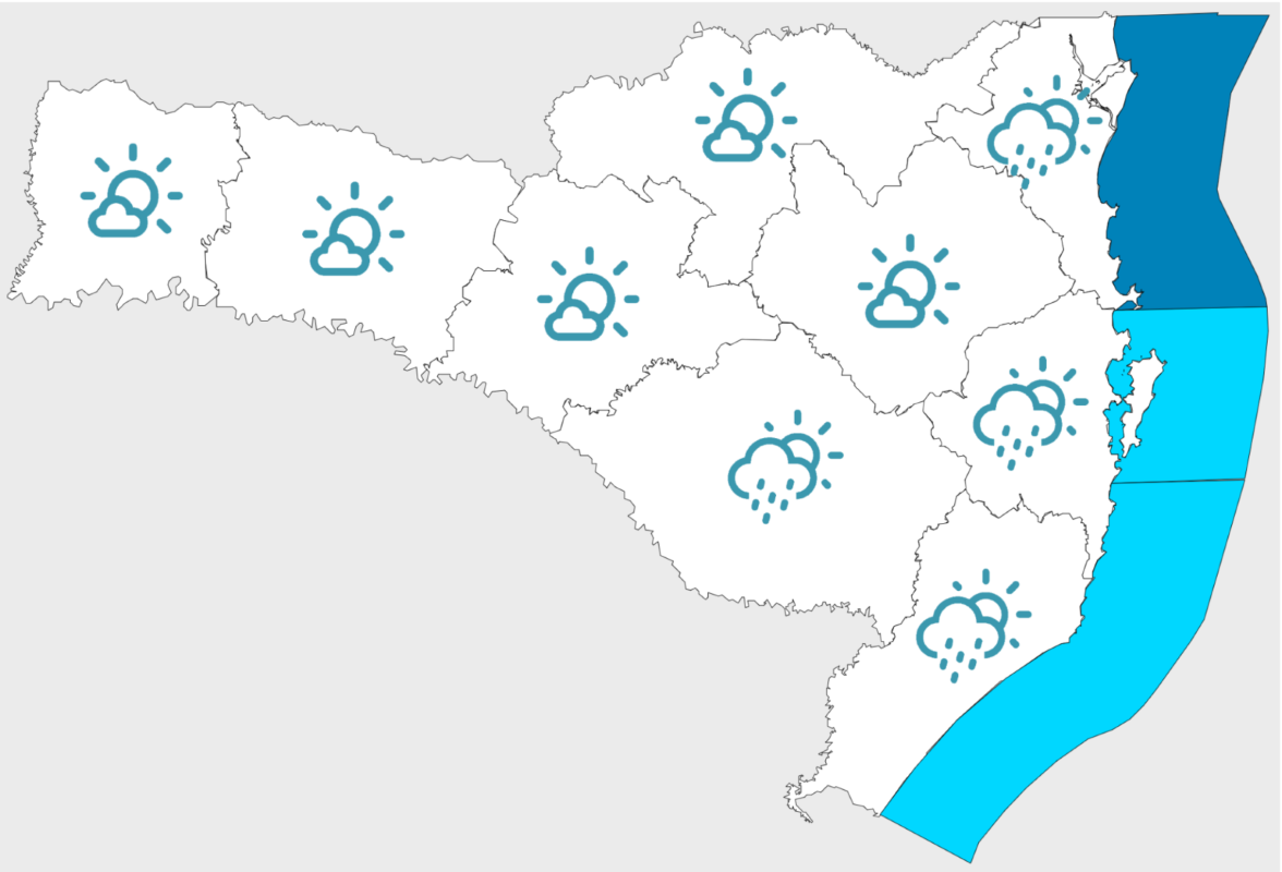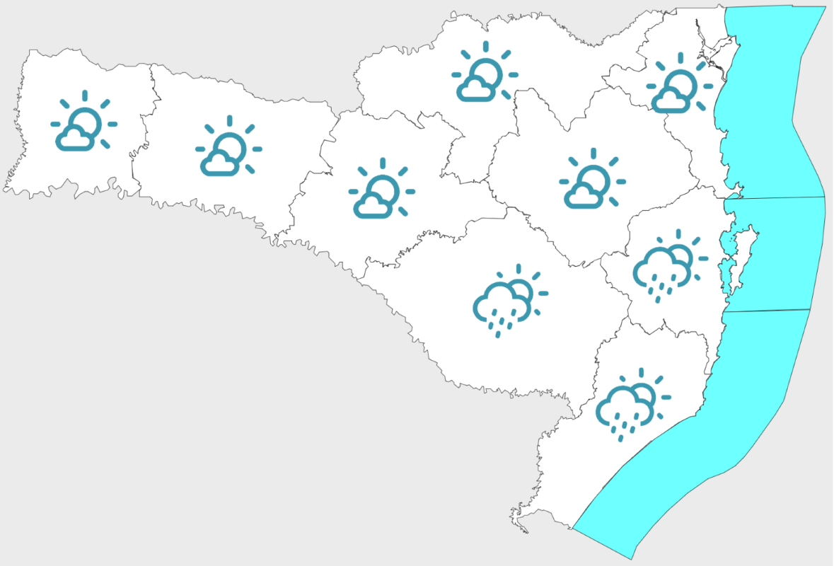 Nesta terça-feira (20), o dia será de sol entre poucas nuvens em todas as regiões do estado. A circulação marítima pode provocar precipitações fracas e pontuais no litoral, mas o risco para ocorrências relacionadas ao tempo é considerado baixo. As temperaturas máximas não ultrapassam os 28°C. No mar, a agitação ainda persiste, principalmente no Litoral Norte, com ondas entre 2 e 3 metros e picos maiores em alto-mar, oferecendo risco moderado para a navegação. Ao longo do dia, a tendência é de diminuição da intensidade das ondas.