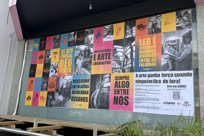 A fachada recebeu uma nova identidade visual por meio de um mural lambe-lambe, técnica de arte urbana caracterizada pela aplicação de cartazes colados.