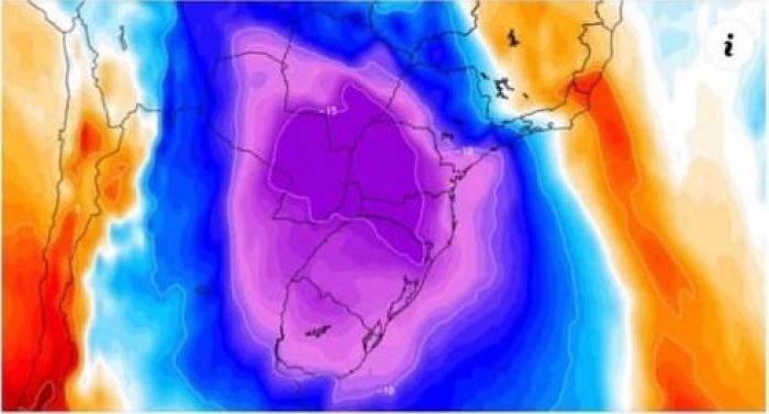 Até o final do dia a frente fria avança em direção ao sudeste do Brasil, dando lugar a uma nova massa de ar frio que provoca declínio acentuado das temperaturas em todas as regiões ao longo do dia. Por isso, o amanhecer de sexta-feira (19) deve ser de temperaturas próximas ou abaixo de 0°C entre o Grande Oeste e os Planaltos catarinense.