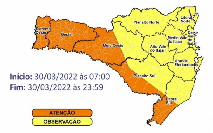 A passagem de uma frente fria já no início da manhã desta quarta-feira (30) provoca a mudança do tempo estável para a condição de chuva e temporais que começam chegando no Extremo Oeste, Oeste e em áreas de divisa com o RS, avançando em direção ao leste do estado catarinense ao longo da tarde e da noite. Há grande probabilidade de chuva intensa em curtos períodos de tempo, principalmente do centro ao oeste, onde o risco é moderado a alto para ocorrências associadas a temporais (rajadas fortes de ventos, raios e granizo) e a chuva intensa (alagamentos e enxurradas). As temperaturas mínimas ficam entre 16 °C e 21°C no Extremo Oeste, Oeste, em parte do Meio-Oeste, parte do Planalto Norte, no vale do Itajaí e no Litoral, já no Planalto sul, parte do Meio-Oeste e do Planalto Norte, elas ficam entre 13°C e 14°C. As máximas devem oscilar entre 25°C e 33°C no início da tarde no litoral, Planalto Norte e no vale do Itajaí e entre 19°C a 23°C nas demais regiões.