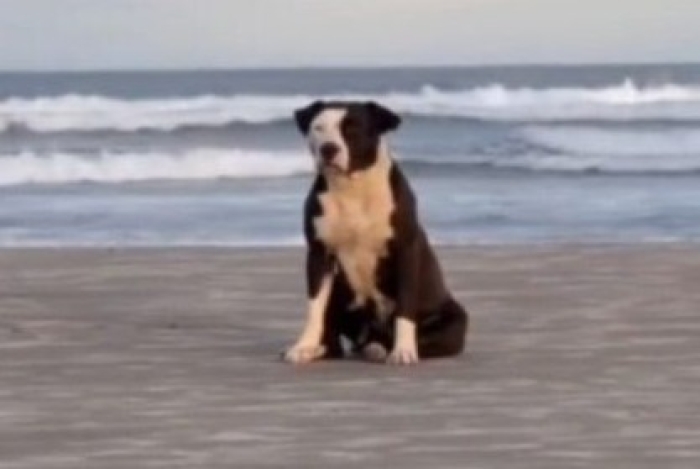 Fotomontagem: Portal Sul Agora Uma cachorra da raça pitbull foi flagrada sozinha, aguardando o próprio dono, após supostamente ter sido abandonada em Itapirubá, praia da região Sul de Imbituba.