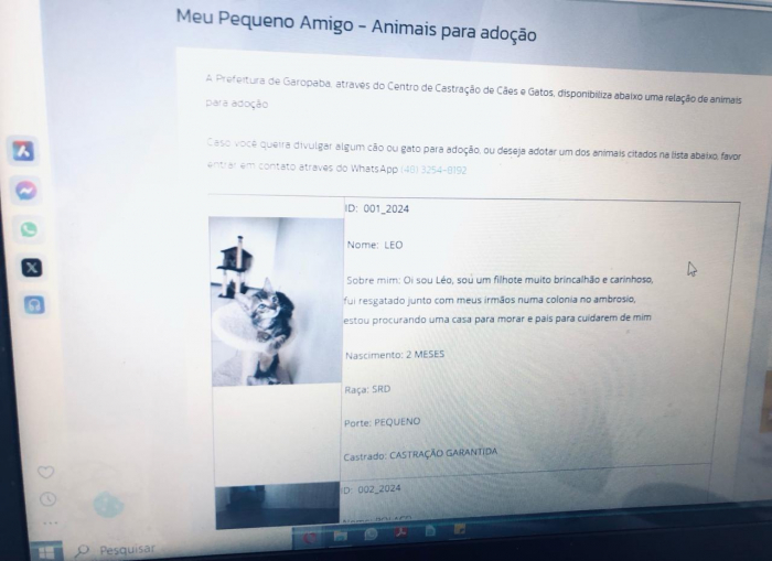 Cada pet cadastrado tem informações como nome, nascimento, raça, porte, entre outras. Depois de escolher, basta entrar em contato com o Centro de Castração de Cães e Gatos, no WhatsApp (48) 3254-8192.