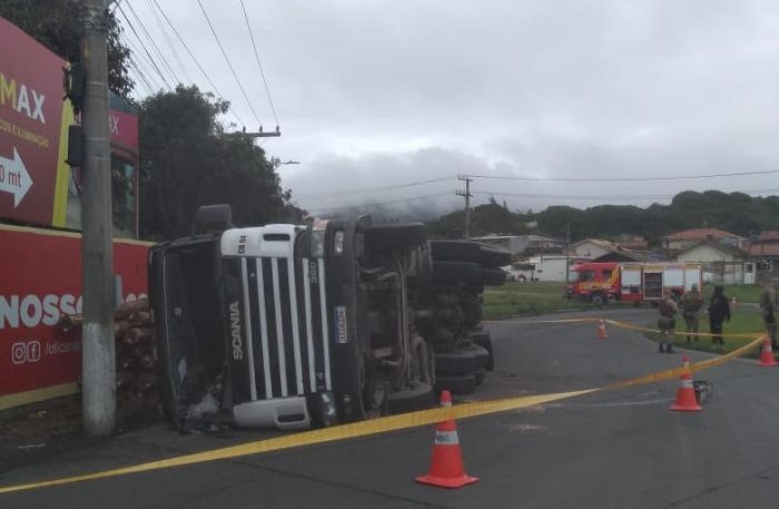 A carreta Scania 360, carregada de toras de madeira e tombou quando fazia o contorno de um trevo na Rua Manoel Florentino Machado em direção ao Porto.
