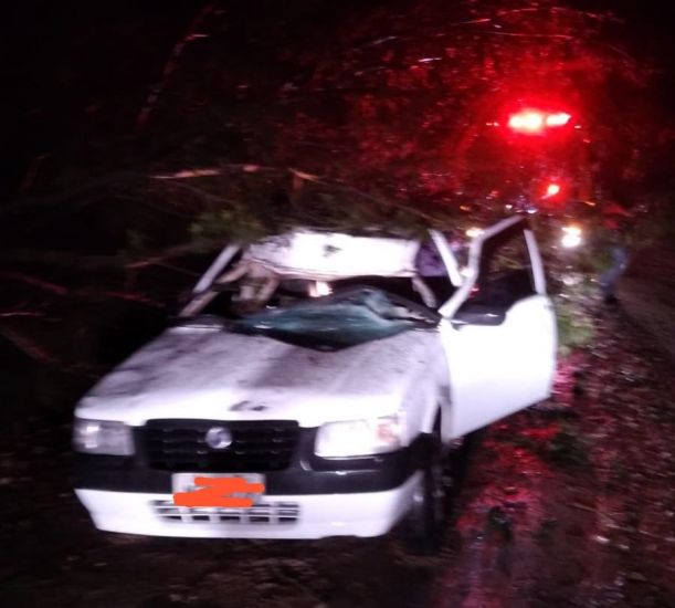 O condutor de um veículo Fiat Uno estava indo em direção ao Centro quando foi surpreendido por uma árvore caída sobre a pista, chocando-se violentamente contra ela. A causa do acidente foi o mau tempo.