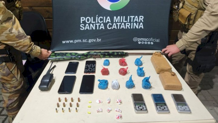 Na noite de quinta-feira, 26, policiais do 34º Batalhão de Polícia Militar de Imbituba apreenderam um adolescente e prenderam um homem por porte ilegal de arma de fogo e munições, além de tráfico de drogas, no bairro Penha, em Paulo Lopes.