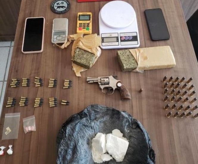 Ao todo, foram apreendidos um revólver calibre 22, 180 gramas de cocaína, 590 gramas de maconha, três comprimidos de ecstasy, três micropontos de LSD, 30 munições calibre 38, 47 munições calibre 22, uma munição calibre 380, duas balanças de precisão e uma máquina de cartão de crédito.