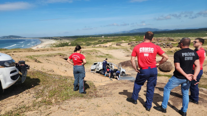 Corpo carbonizado foi encontrado em veículo incendiado na Pedra do Frade, em Laguna, na manhã desta segunda-feira (23).