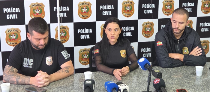 A coletiva de imprensa da Polícia Civil sobre o homicídio contou com as presenças da delegada regional de Tubarão, Carolini de Bona Portão, e dos delegados Bruno Martins e André Crisóstomo, da Delegacia de Investigação Criminal (DIC).