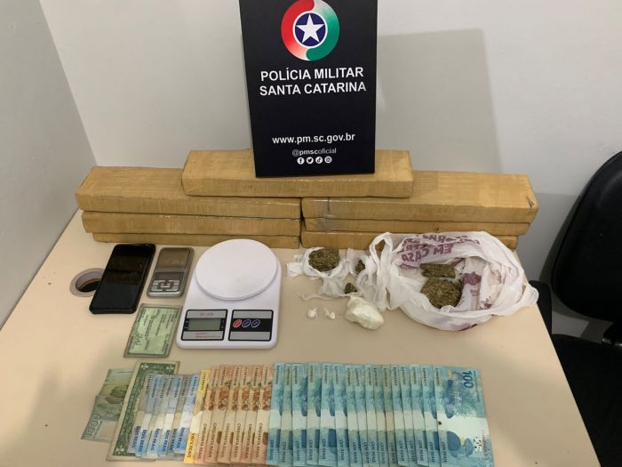 Foram apreendidos com o suspeito 54 gramas de cocaína, 10 quilos de maconha, 1 aparelho celular, R$ 1.934 em dinheiro, $ 1.000 pesos chilenos e 2 balanças de precisão.