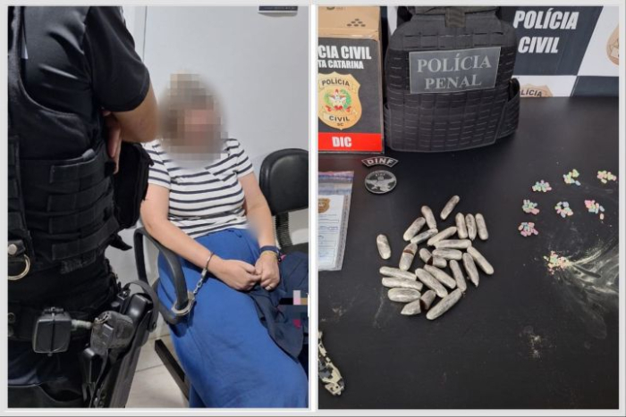Fotomontagem: Portal Sul Agora No início da tarde desta quarta-feira (3), uma operação conjunta entre a Polícia Penal e a Polícia Civil resultou na prisão em flagrante de uma professora que tentava introduzir drogas e aparelhos celulares no Presídio Regional de Tubarão.