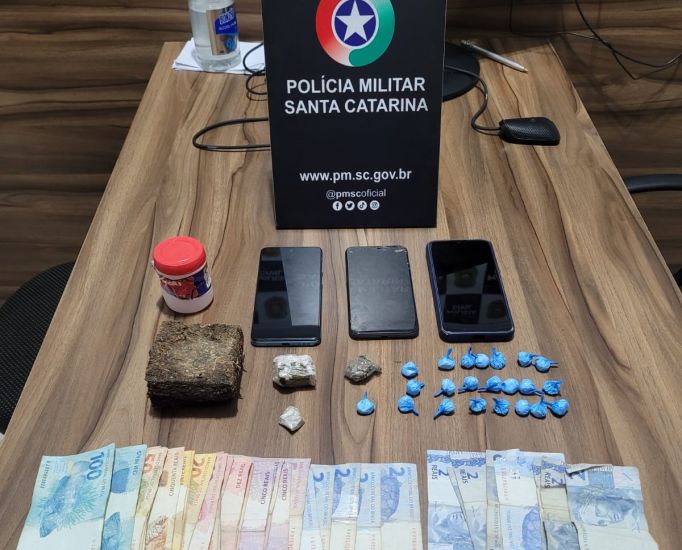 Foram apreendidas no local 22 petecas de cocaína prontas para a venda, quatro torrões de maconha, três celulares e R$ 924 em dinheiro.