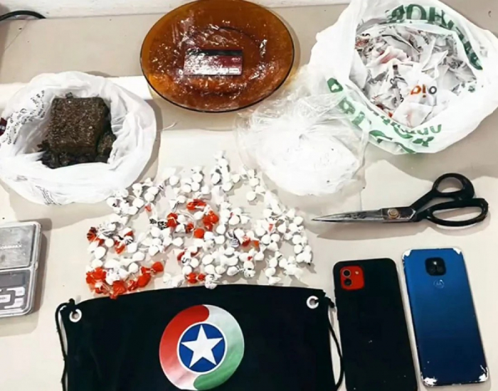 A residência fica no bairro Santo Antônio de Pádua e a Polícia Militar, após denúncias, realizou o flagrante, apreendendo, com a ajuda de um cão farejador,145,7gramas de maconha e 98,2 gramas de cocaína, embaladas e prontas para a venda, como também materiais utilizados para embalar a droga, como tesouras e plásticos.