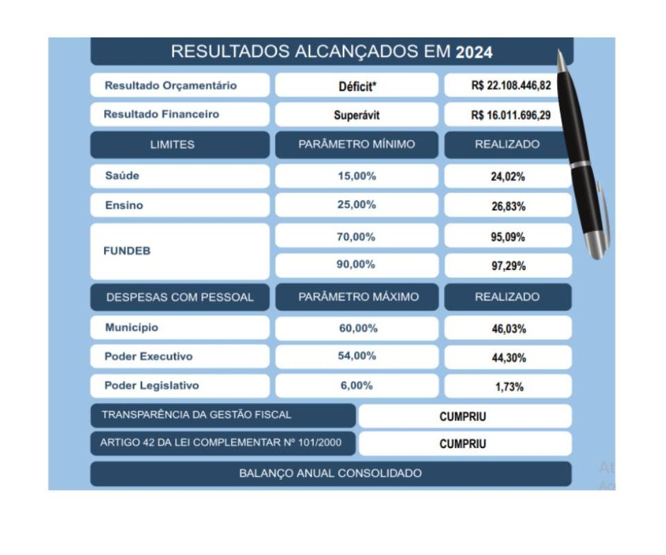 Um dos pontos destacados pelo administrador foi o resultado financeiro de 2024, apresentando superávit de R$ 16 milhões e a aplicação de 24,02% das receitas em Saúde, superando com folga o mínimo constitucional que é de 15%.