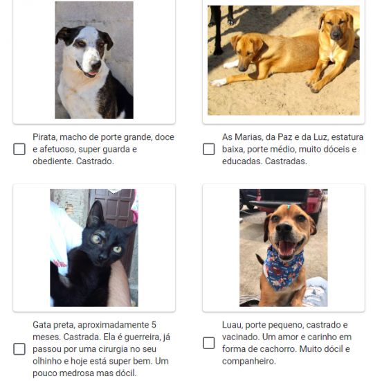 Pela plataforma, além de ver as os animais, o morador interessado deve preencher um formulário e agendar uma visita para conhecer, presencialmente, os cães e gatos. Basta acessar o link clicando aqui. Na página, o usuário deve escolher entre falar com o centro pelo WhatsApp ou acessar, diretamente, a Feira de Adoção 24 horas.