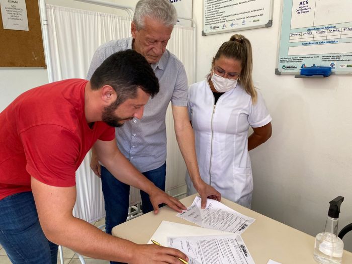 Estiveram presentes no ato de assinatura da Ordem de Serviço, além de uma representante da empresa SAVE Engenharia, o chefe de gabinete, Renato Figueredo, o presidente da câmara de vereadores, Leonir de Sousa, bem como, os vereadores, Thiago Rosa e Matheus Paladini, além da enfermeira chefe da UBS, Débora Thomsen.