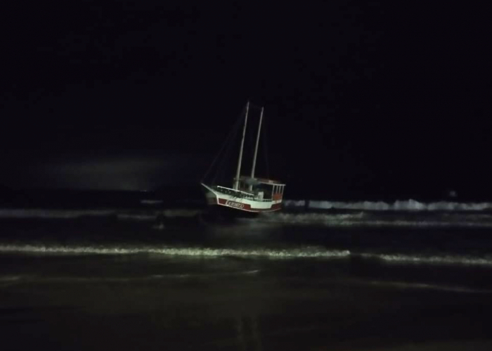 Uma embarcação de 20 metros (aproximadamente 65 pés) encalhou na zona de arrebentação da praia Central de Garopaba durante a noite deste sábado (6).