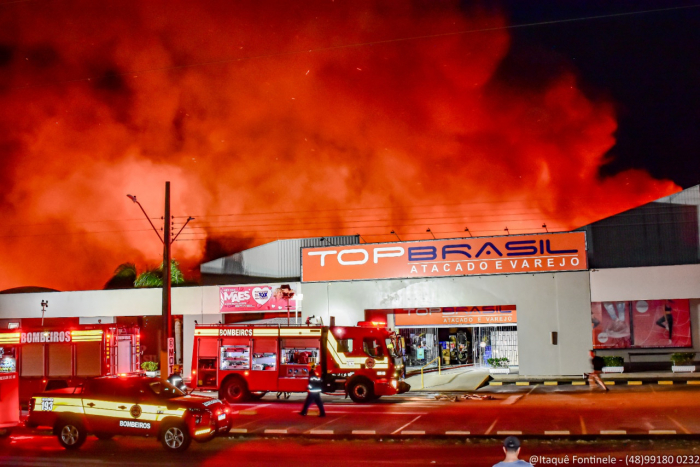 FOTOS: Itaquê Sales Fontinele / Notisul Digital Lugar de referência em compras na cidade de Tubarão, inclusive para turistas a caminho do litoral catarinense, o Atacado Top Brasil, ardeu em chamas durante a noite de sexta-feira (24) e a madrugada deste sábado (25).