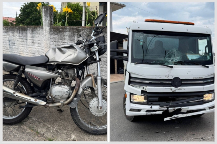 Fotomontagem: Portal Sul Agora Fotos: 8° BBM Uma colisão frontal entre uma moto e um caminhão, na tarde desta segunda-feira (20), deixou um motociclista gravemente ferido, em Laguna.