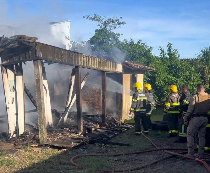 Quase toda a estrutura da casa mista de madeira e alvenaria foi destruída pelas chamas.